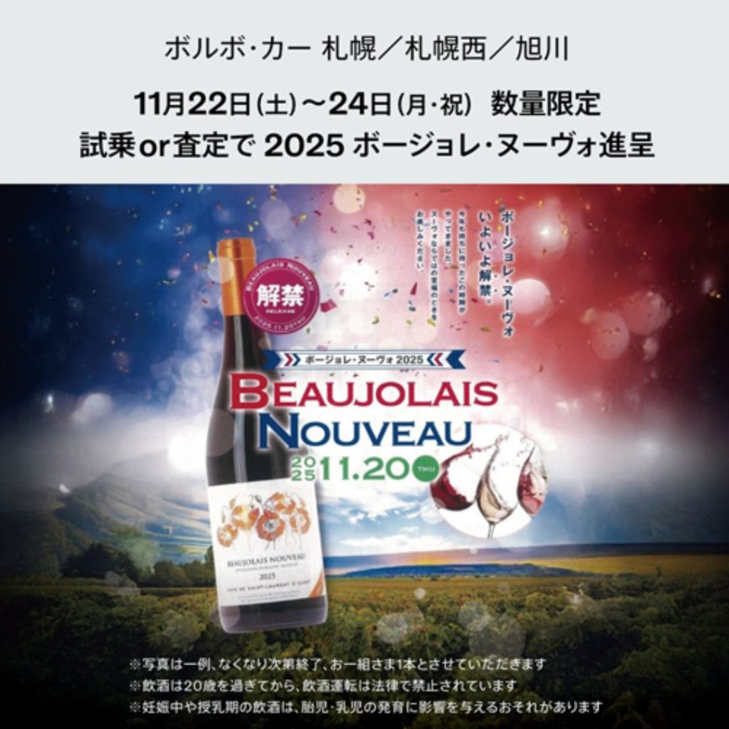 ボルボ・カー 札幌/ボルボ・カー 札幌西/ボルボ・カー 旭川では、11/22(土)~24(月・祝)の期間中、試乗or査定の方に2025の「ボージョレ・ヌーヴォ」をプレゼント